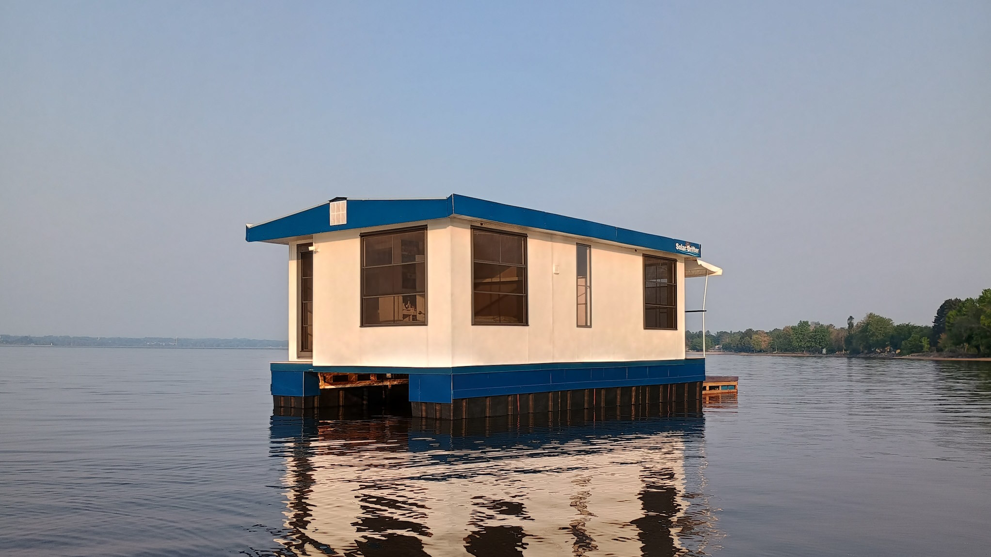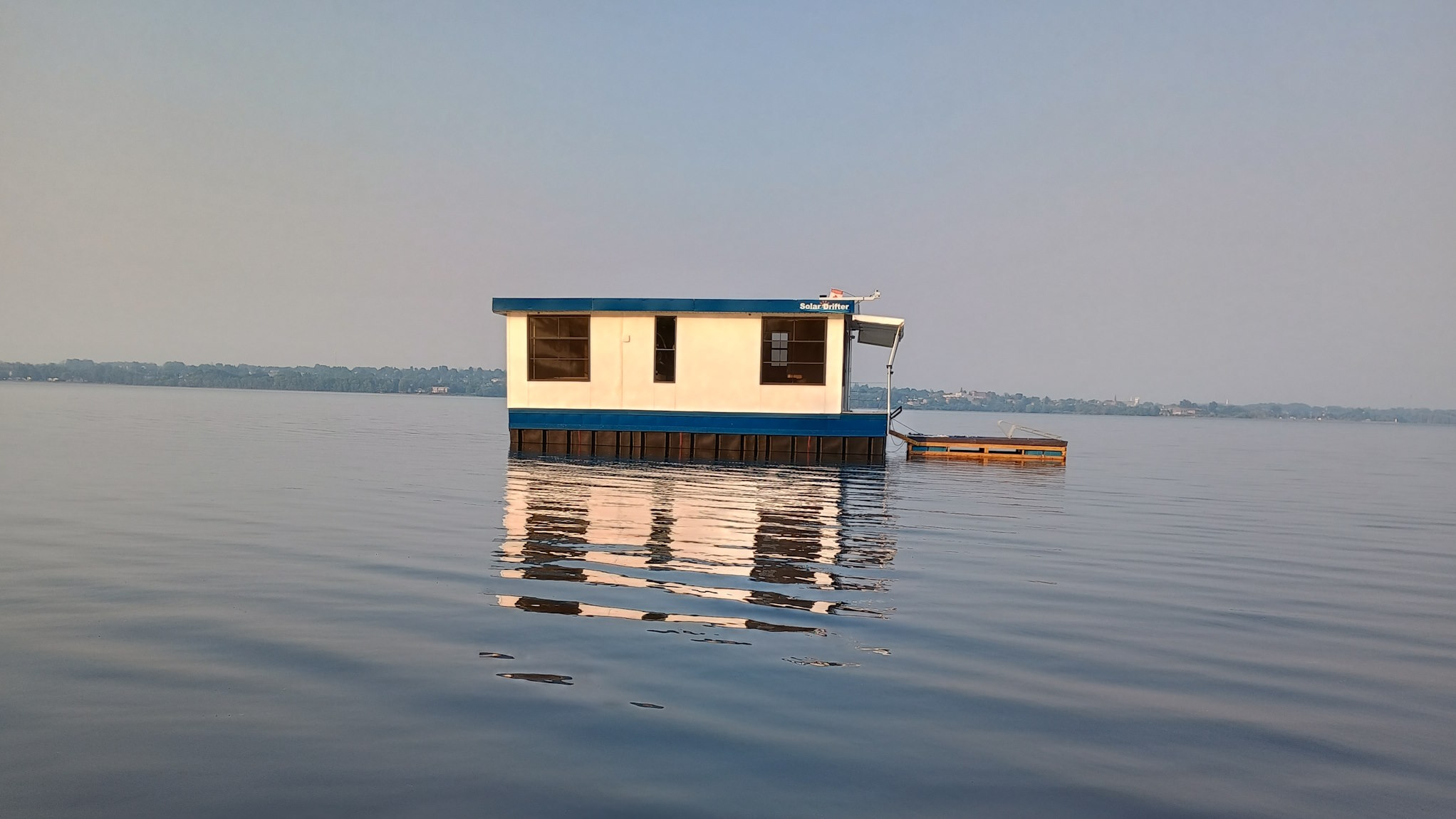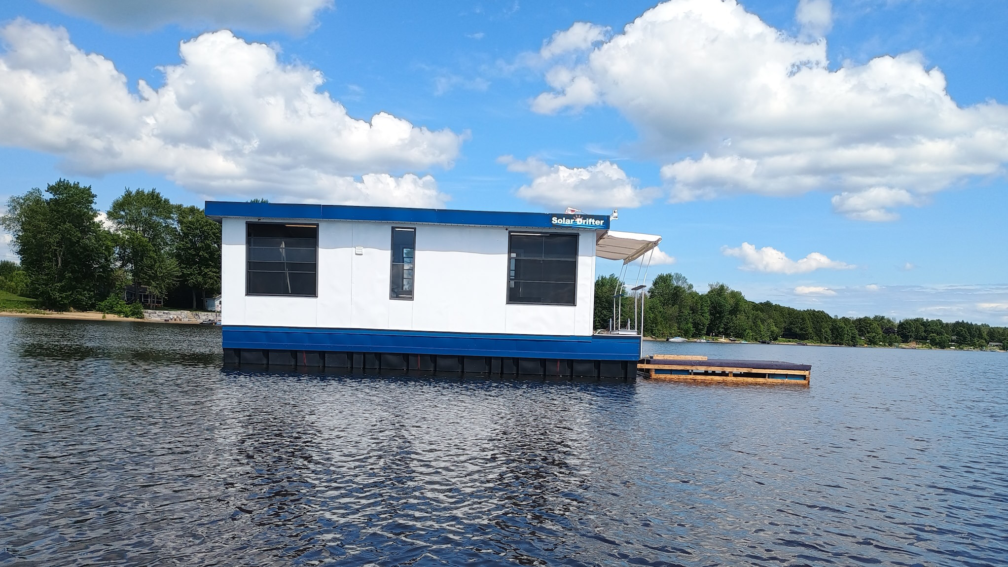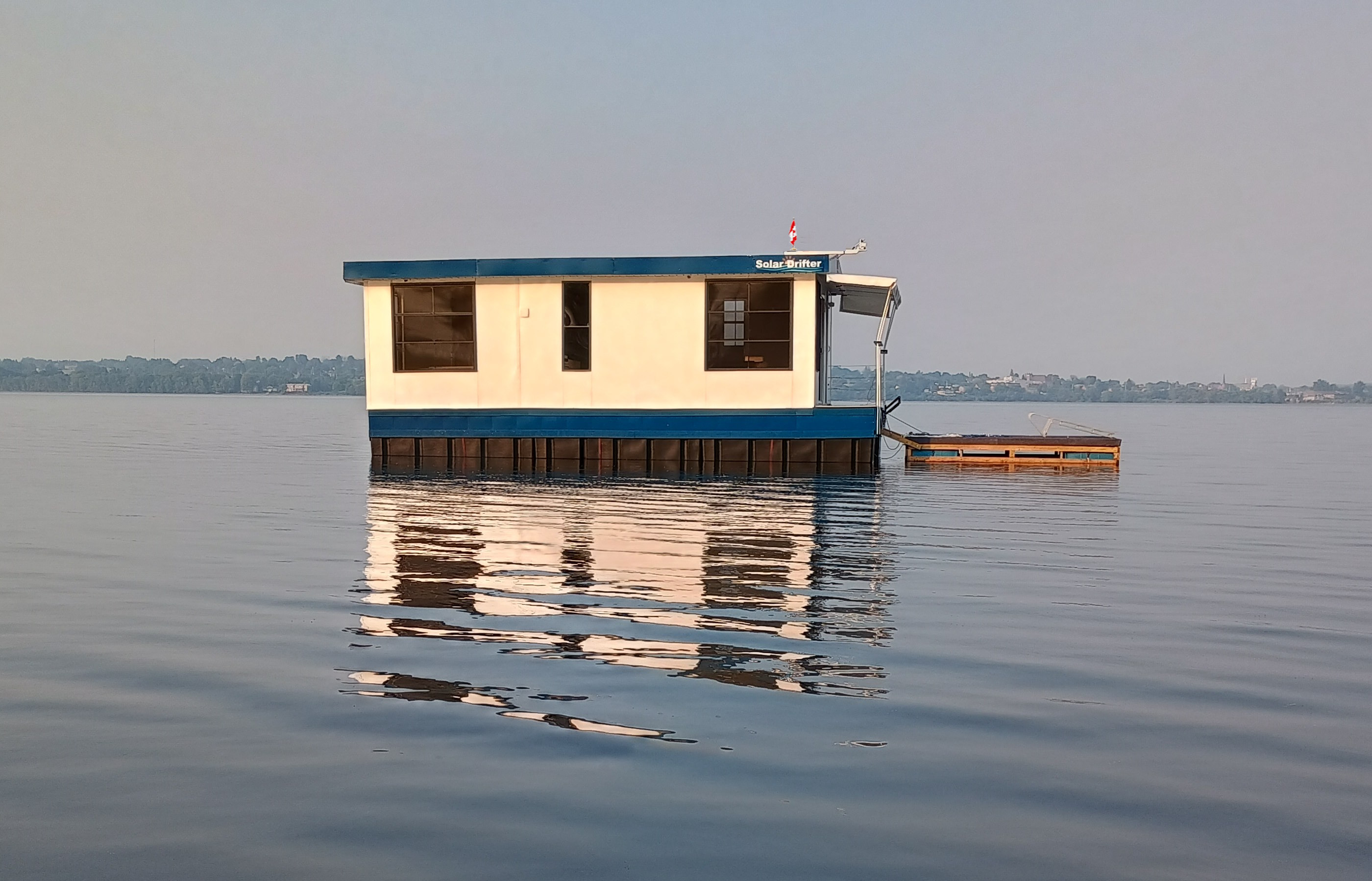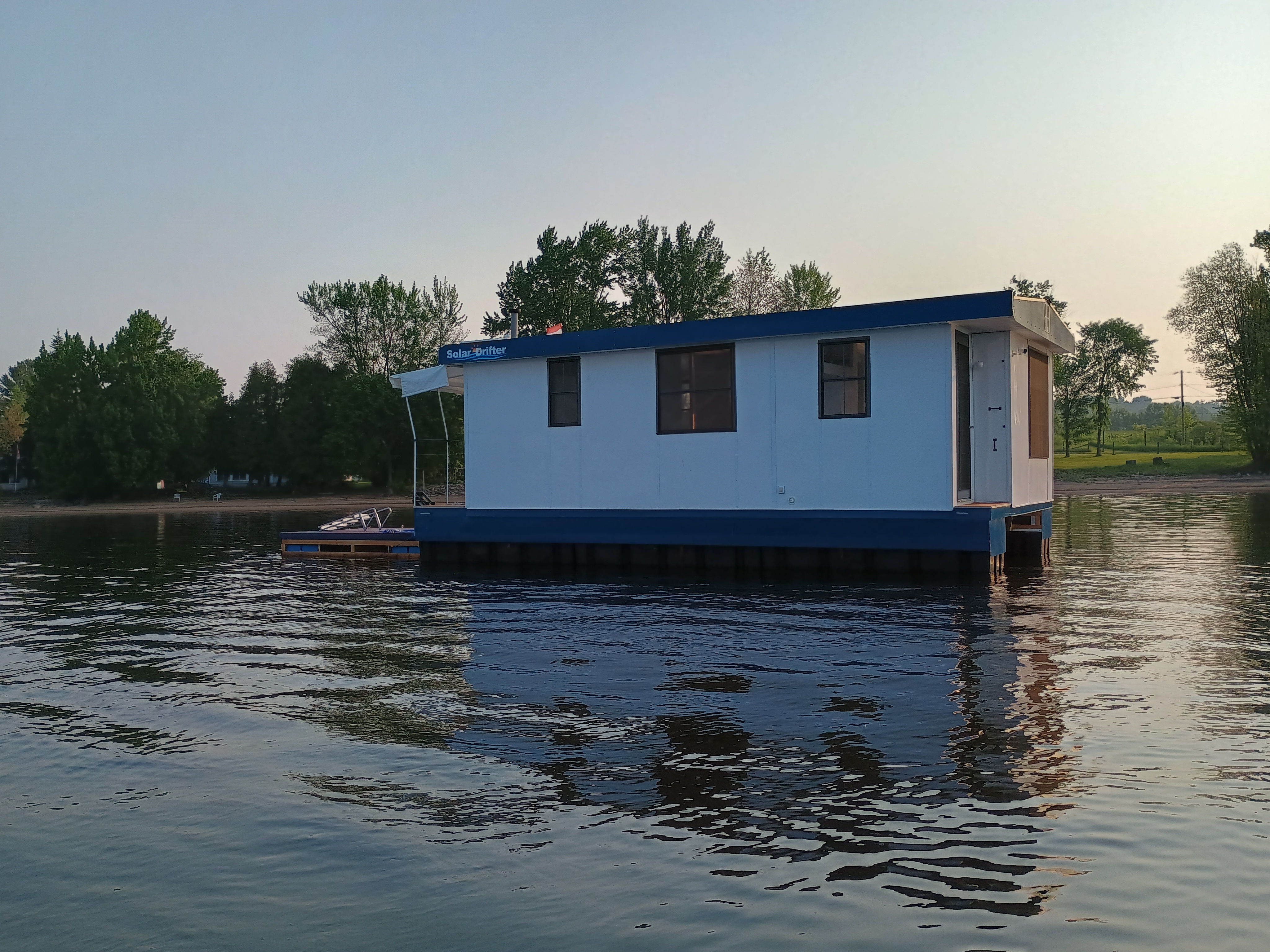 Solar Drifter moored near the family cottage on the Ottawa River after the historic maiden launch — a major milestone in the project - undergoing trials, testing and outfitting.