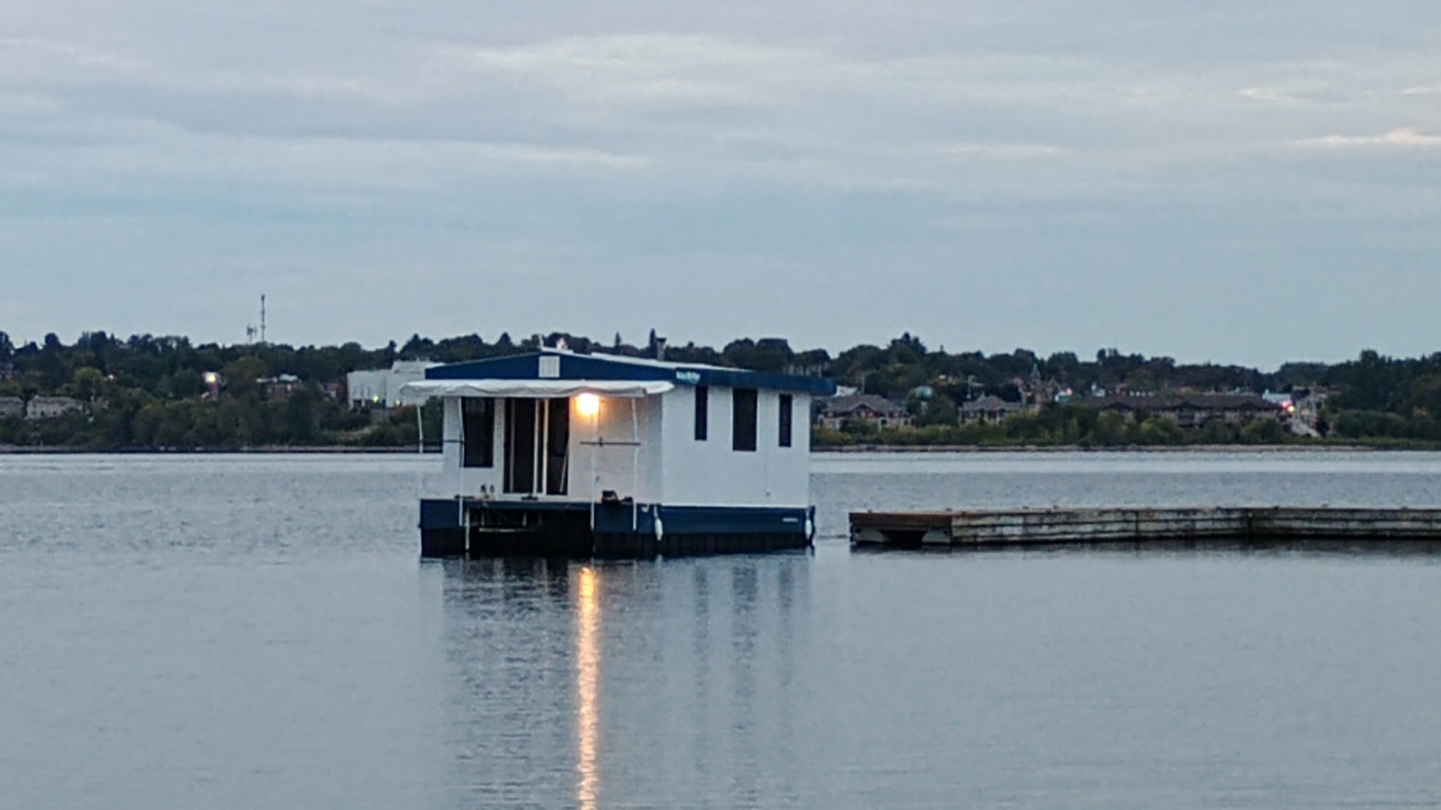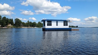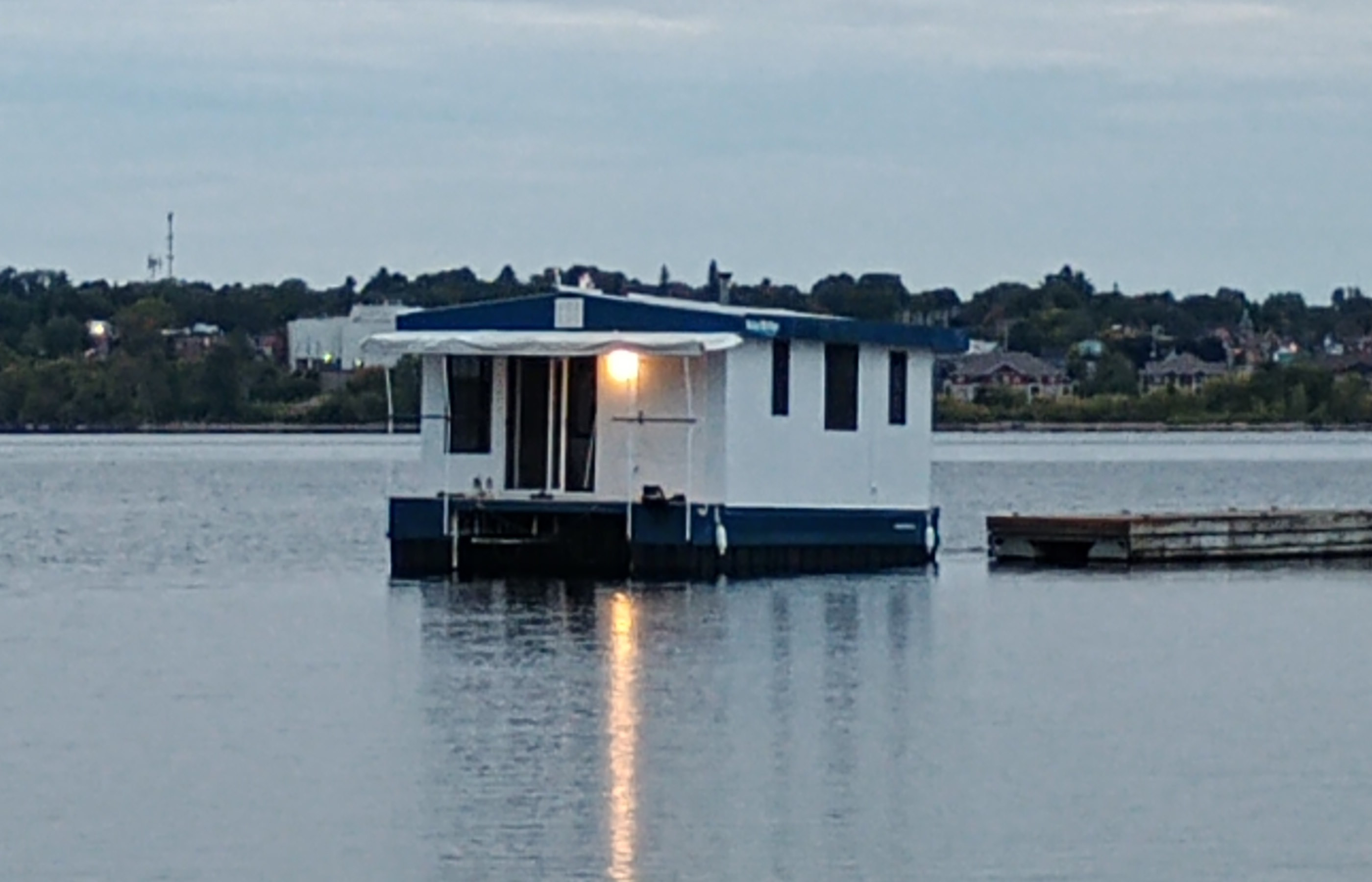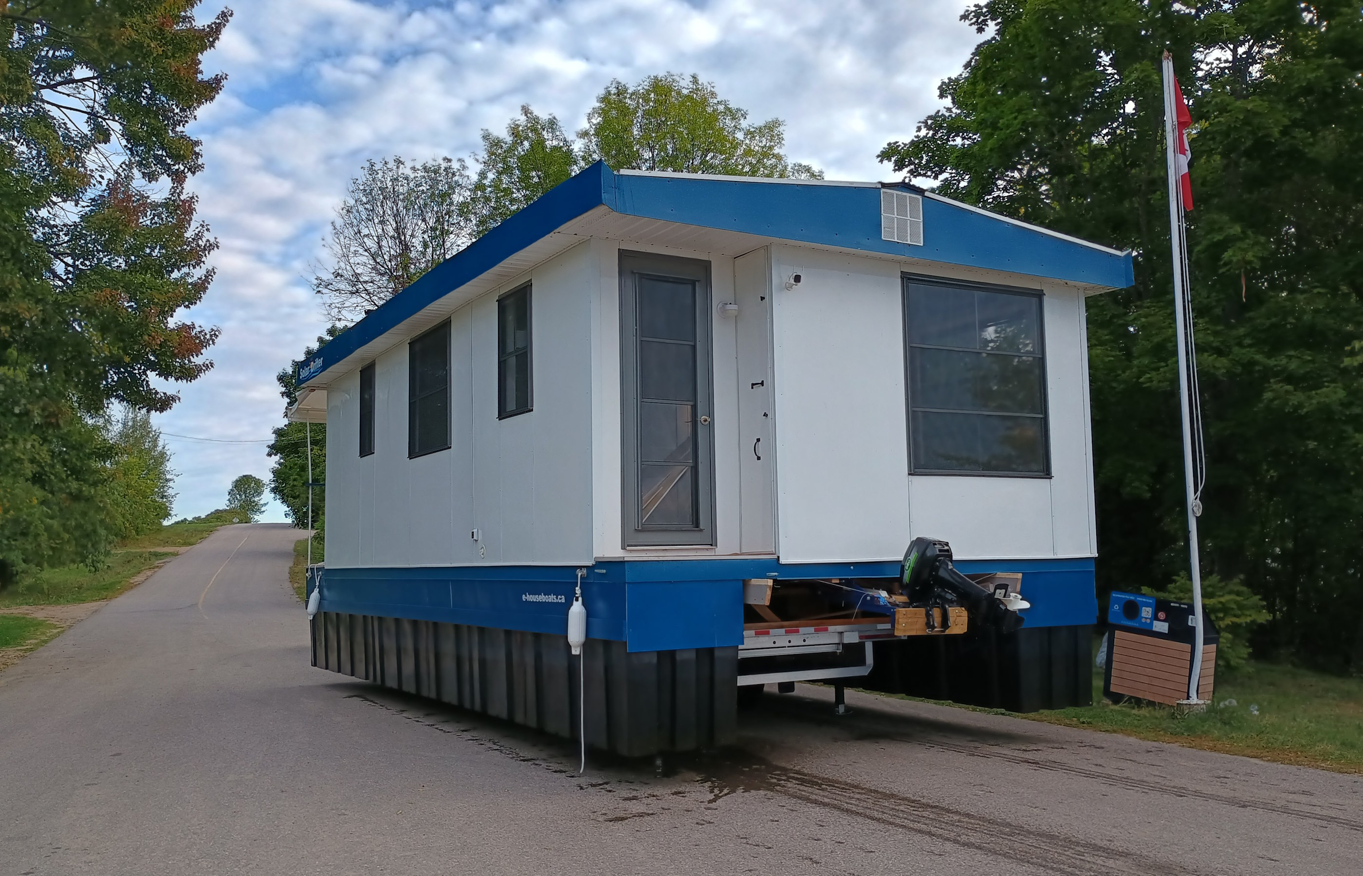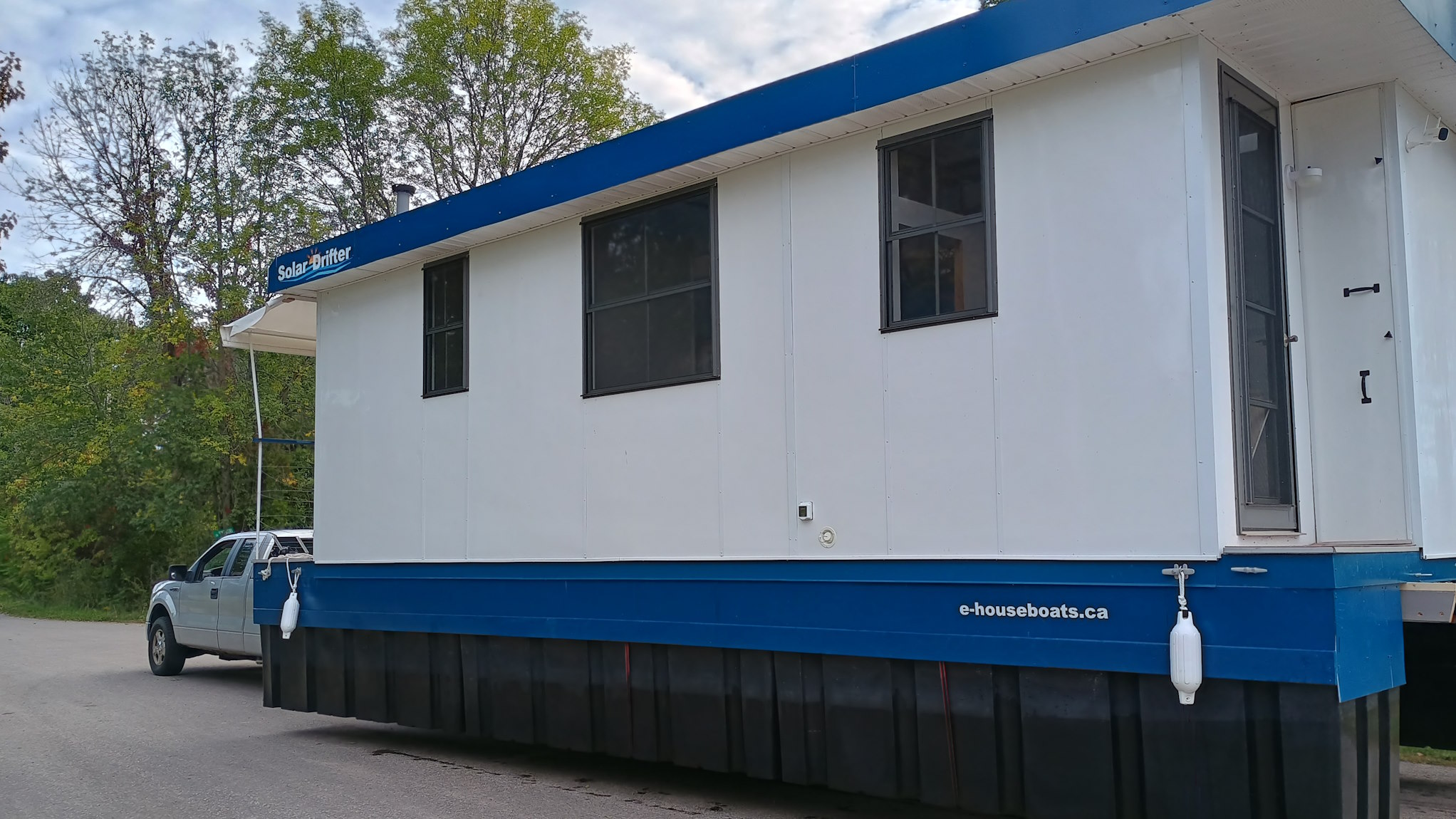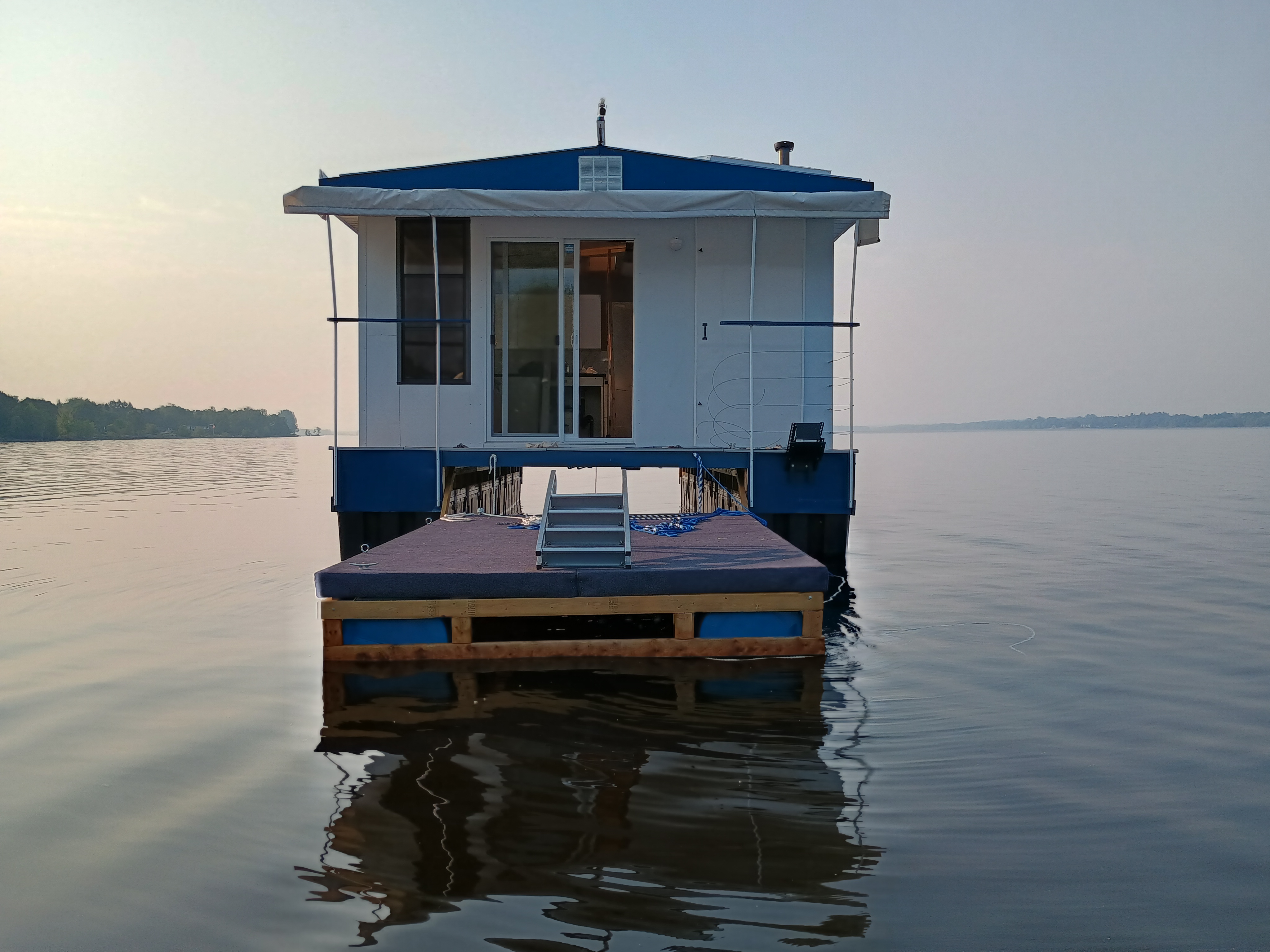 Solar Drifter moored near the family cottage on the Ottawa River after the historic maiden launch — a major milestone in the project - undergoing trials, testing and outfitting.