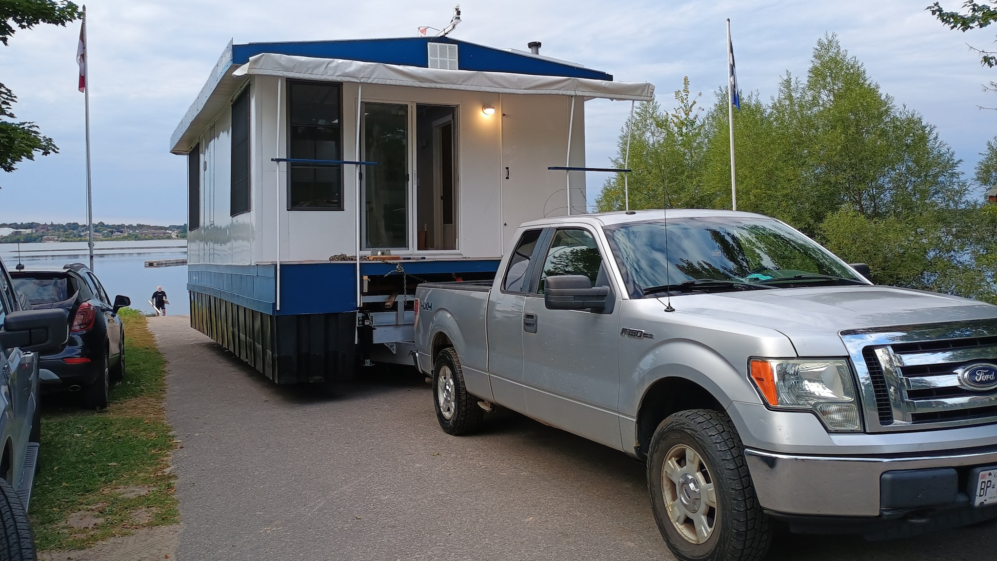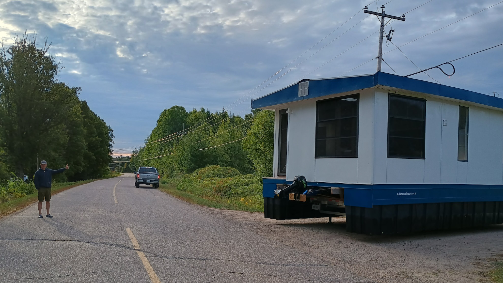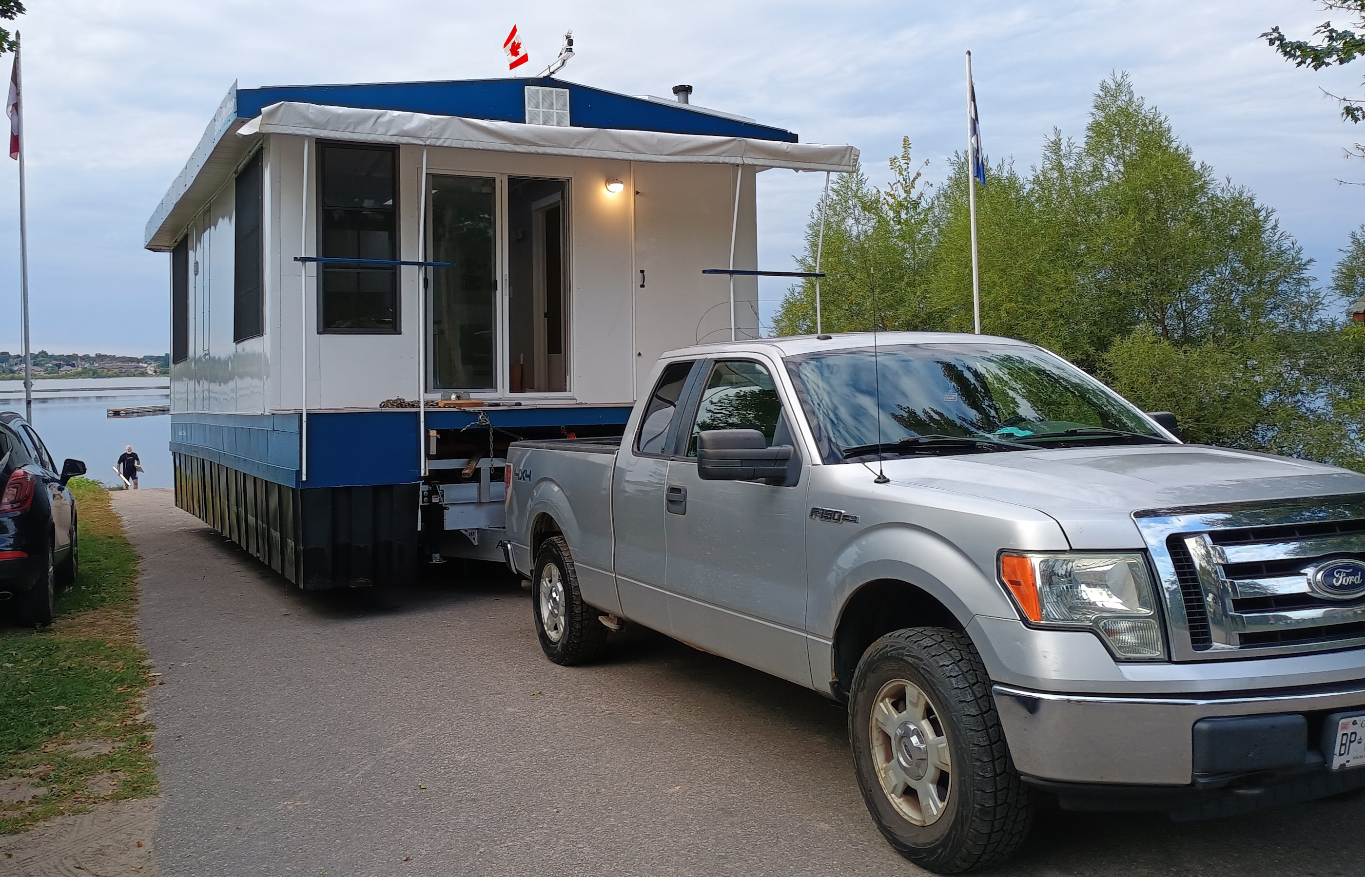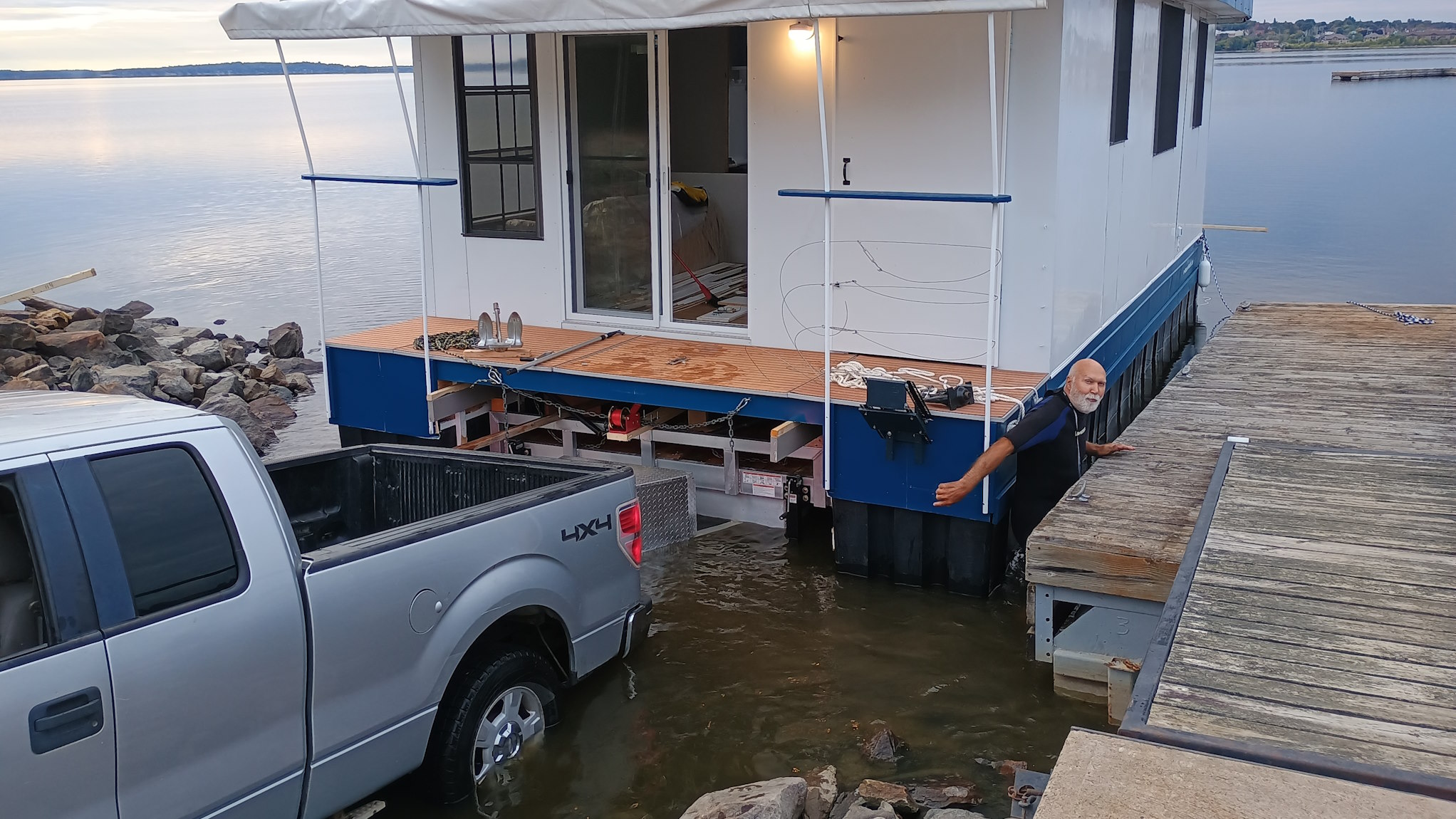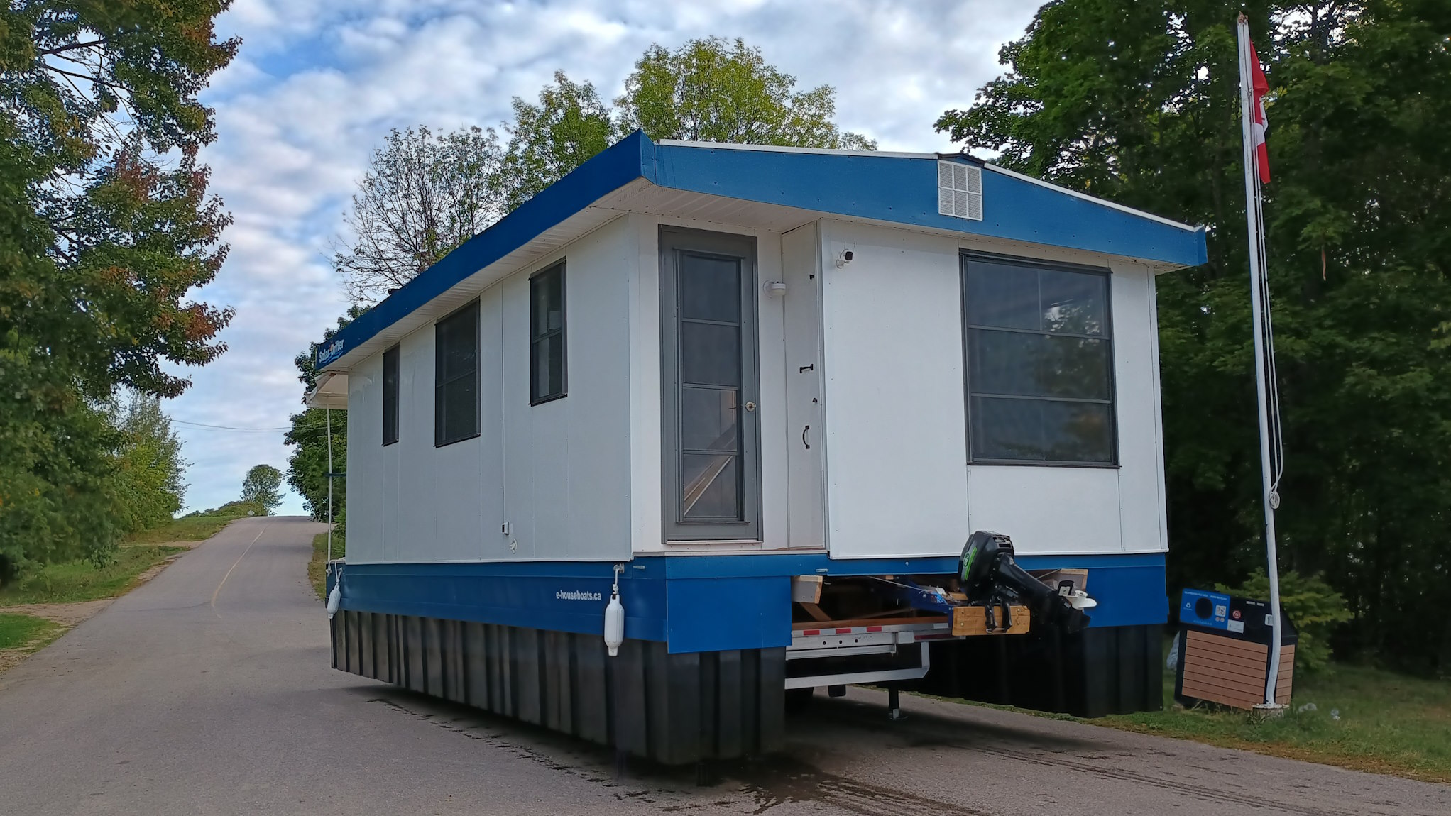 Solar Drifter moored near the family cottage on the Ottawa River after the historic maiden launch — a major milestone in the project - undergoing trials, testing and outfitting.