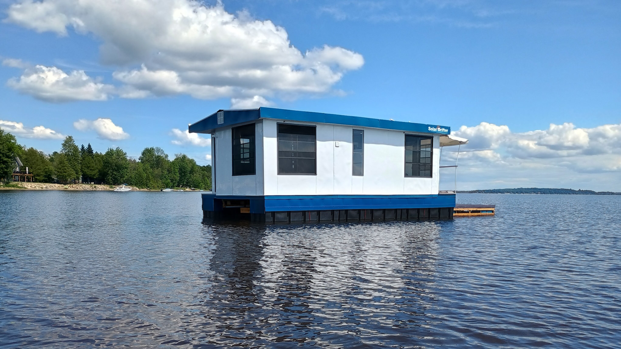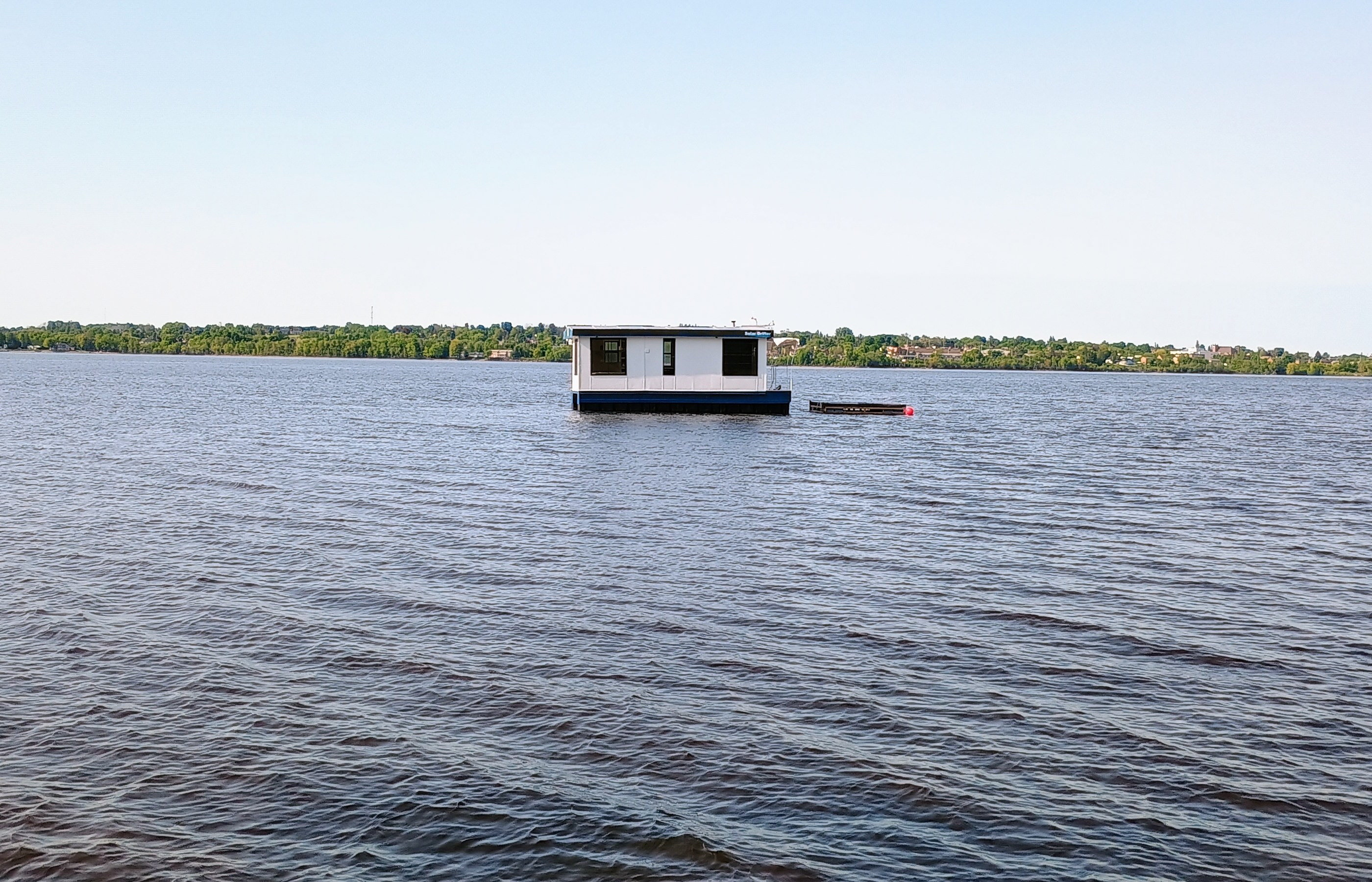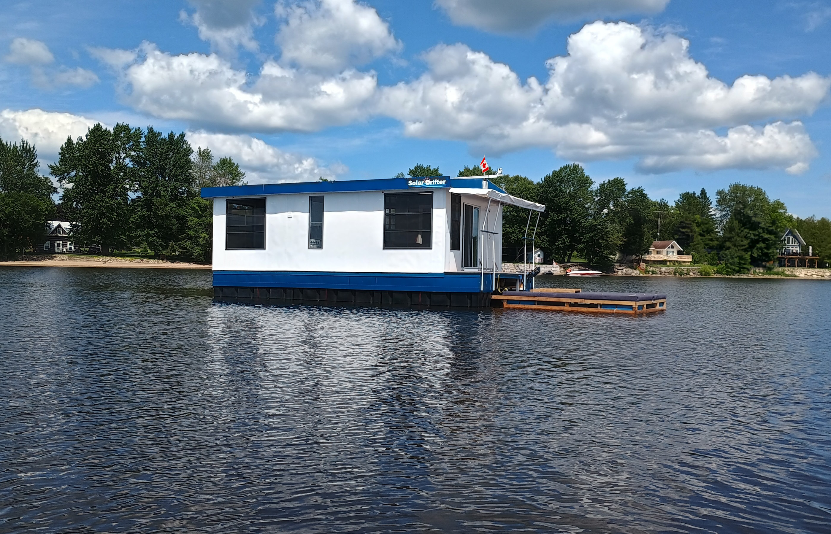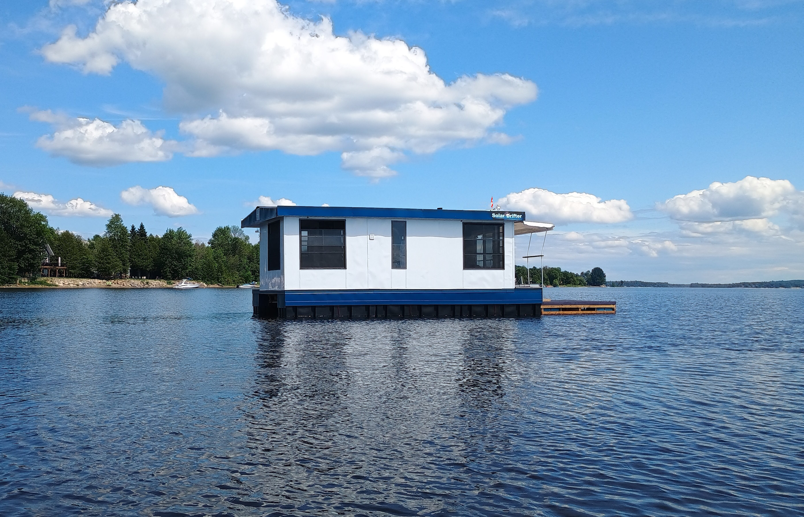 Solar Drifter moored near the family cottage on the Ottawa River after the historic maiden launch — a major milestone in the project - undergoing trials, testing and outfitting.