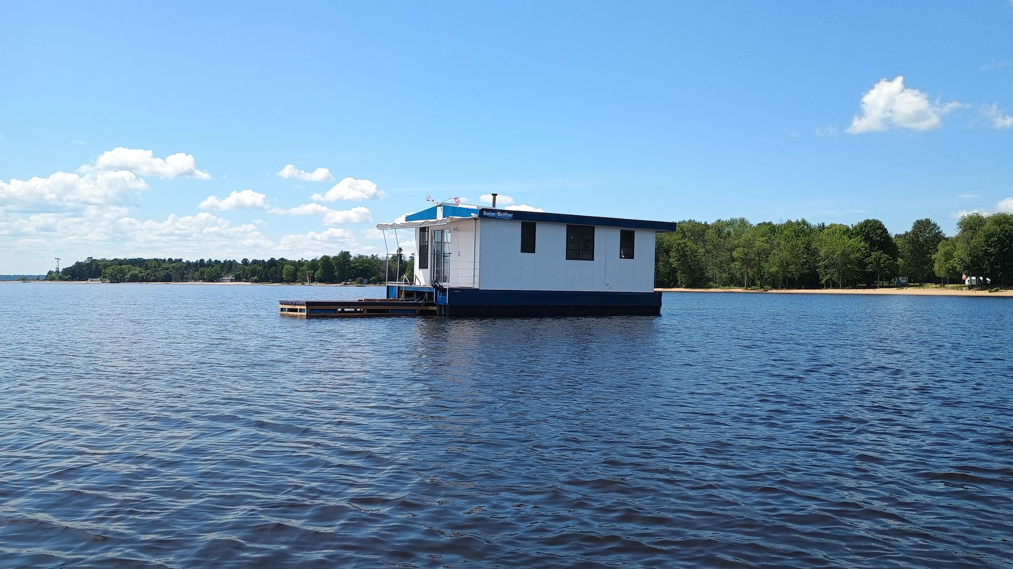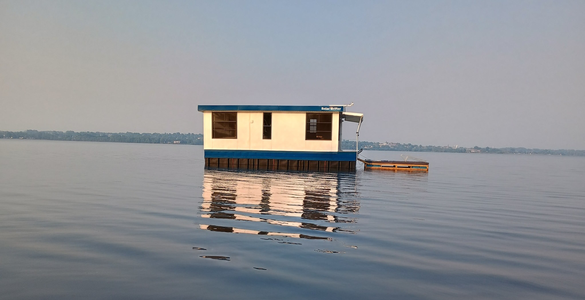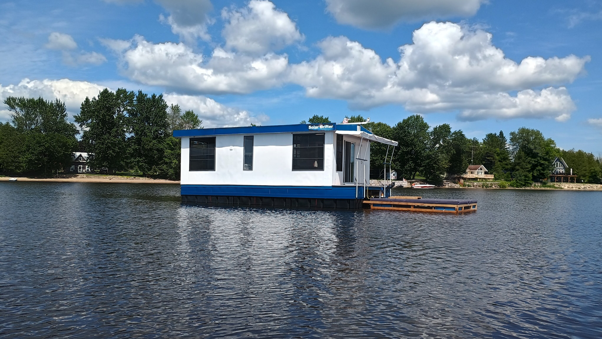 Solar Drifter moored near the family cottage on the Ottawa River after the historic maiden launch — a major milestone in the project - undergoing trials, testing and outfitting.