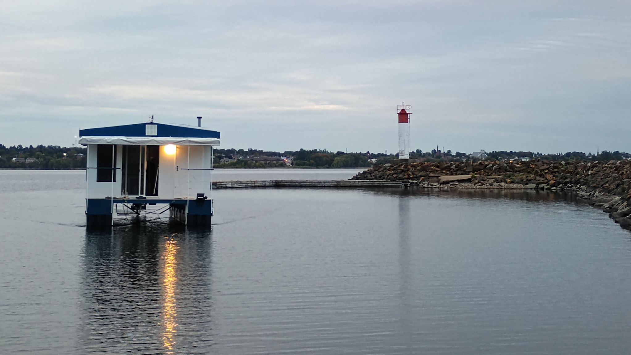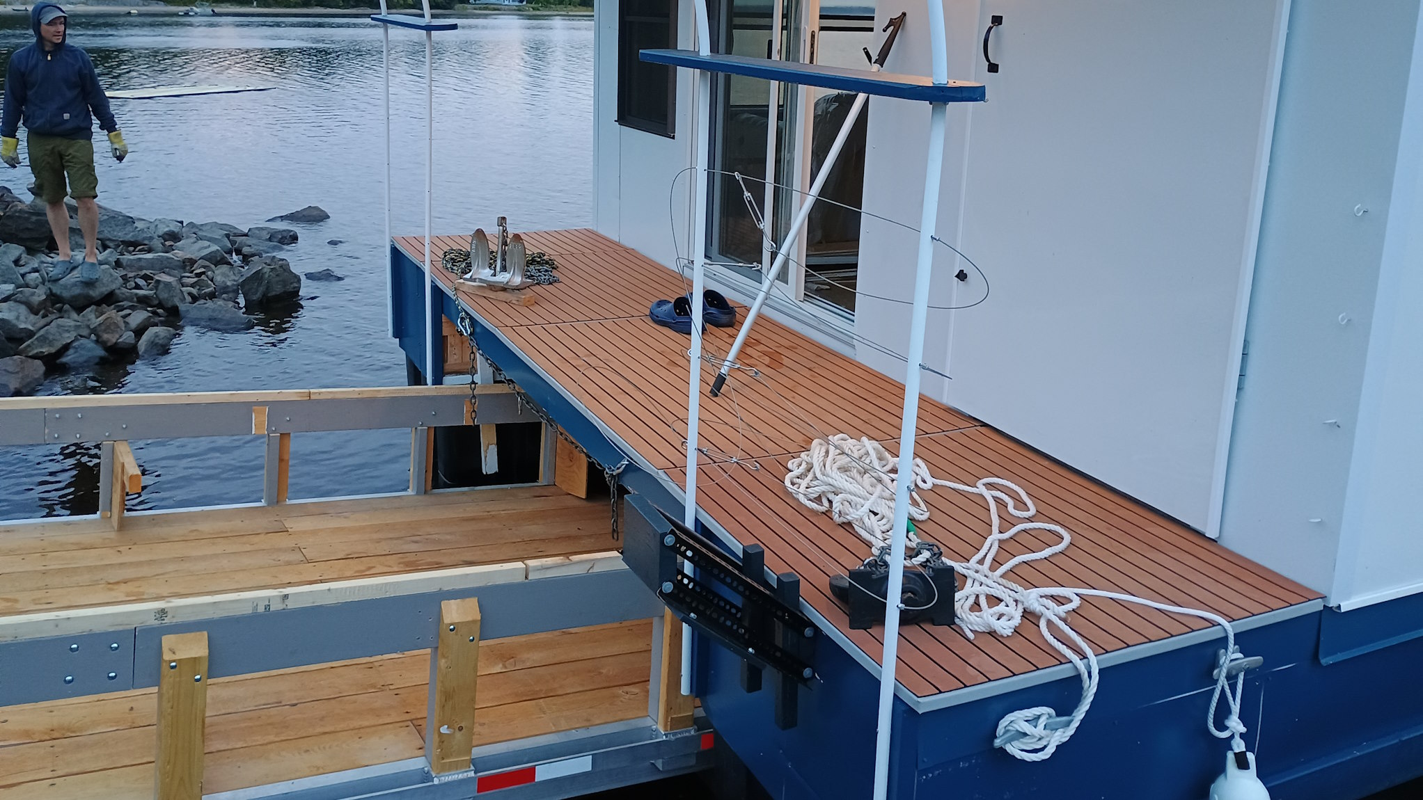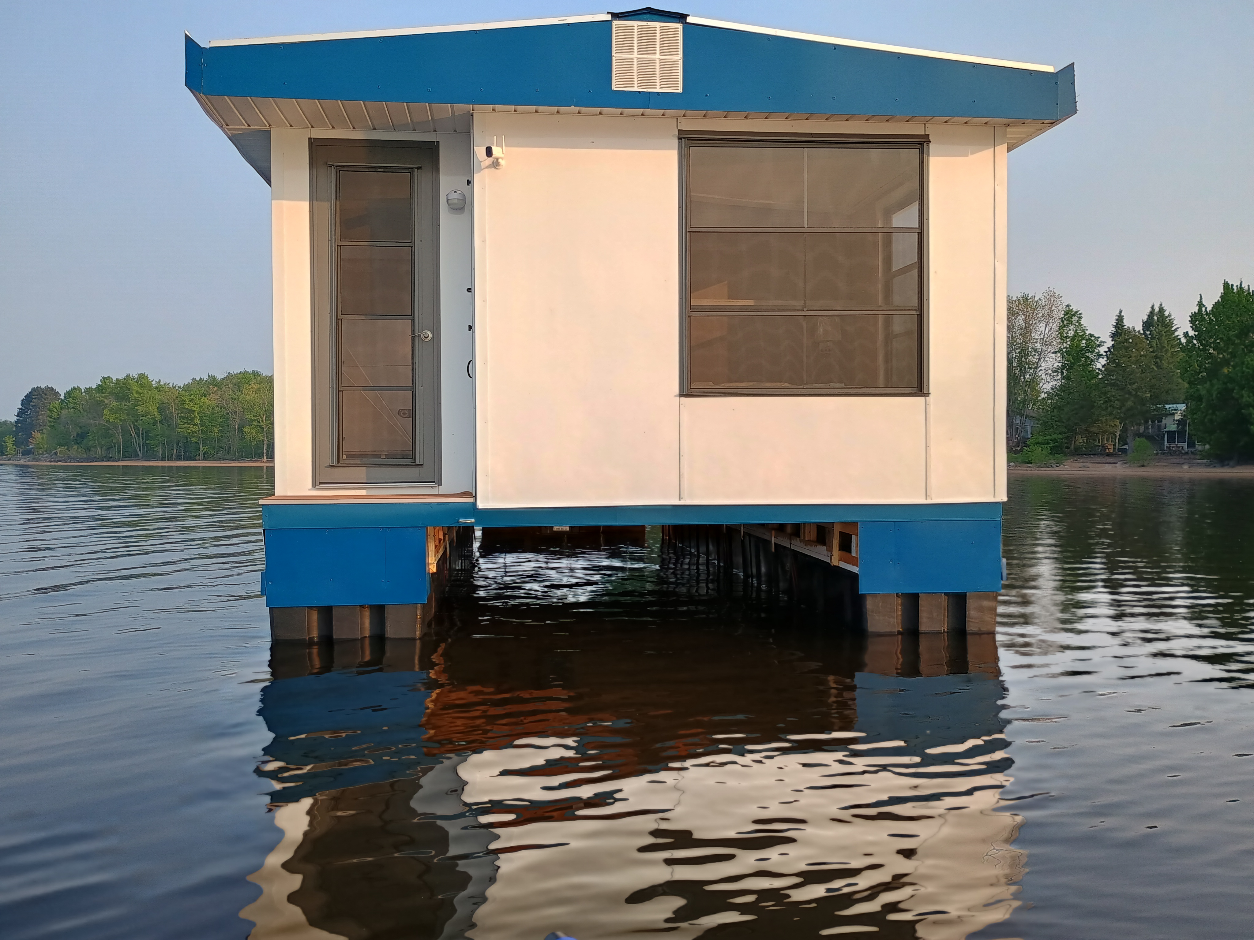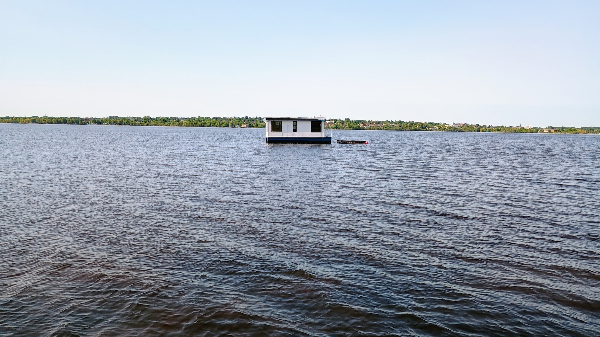 Solar Drifter moored near the family cottage on the Ottawa River after the historic maiden launch — a major milestone in the project - undergoing trials, testing and outfitting.